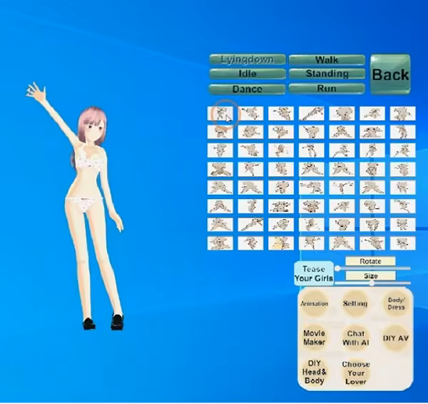 这款游戏释放了玩家的创造力,使他们可以创造出爱慕的、可爱的女孩。与Steam上其他现有游戏不同的是,女孩具有AI灵魂。玩家可以量身定制女孩的身体特征,动作与舞蹈,聊天的语音语调,并从计算机上传照片以生成自己选择的面孔,比如,可以是对您很重要的人。并且该游戏是一个不常见的双模游戏哦!这意味着您既可以像平常游戏那样全屏娱乐,也可以切换到桌面悬浮舞姬模式,让她乖巧的在桌面一角随各种曲子舞动曼妙的身体。