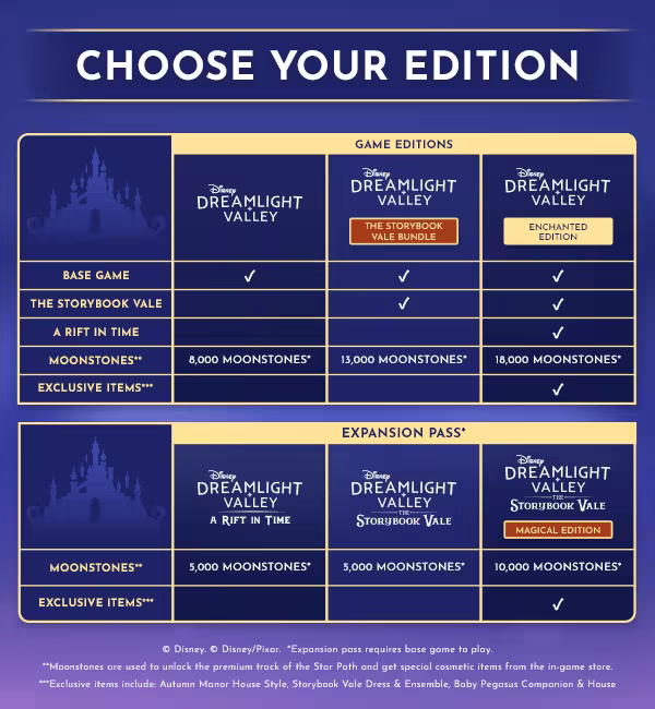 This bundle includes the Disney Dreamlight Valley base game; the new Expansion Pass, Disney Dreamlight Valley: The Storybook Vale; and 13,000 Moonstones.
