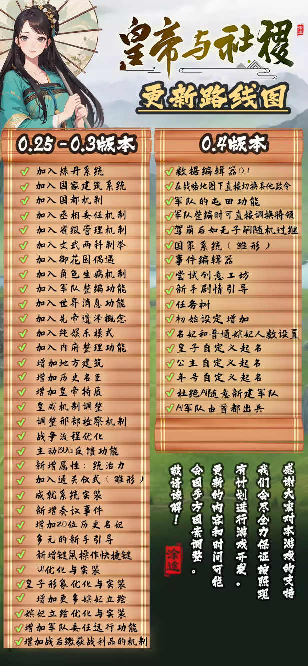 《皇帝与社稷》是一款融合了策略、经营、养成、收集等玩法的皇帝模拟游戏。玩家将扮演古代的君主,治理国家、收集历代名臣妃子、培育后代,最终通过世代传承,建设一个长盛不衰的帝国。