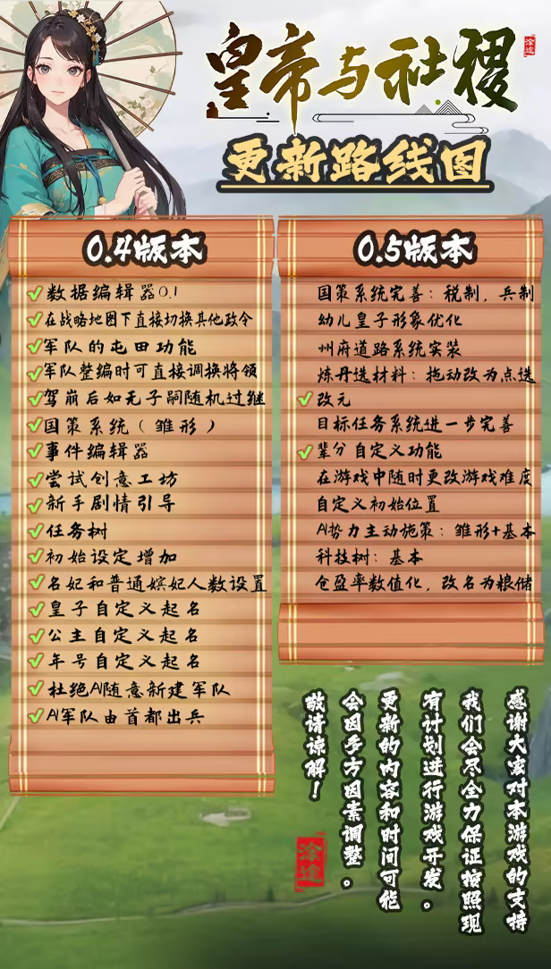 《皇帝与社稷》是一款融合了策略、经营、养成、收集等玩法的皇帝模拟游戏。玩家将扮演古代的君主,治理国家、收集历代名臣妃子、培育后代,最终通过世代传承,建设一个长盛不衰的帝国。