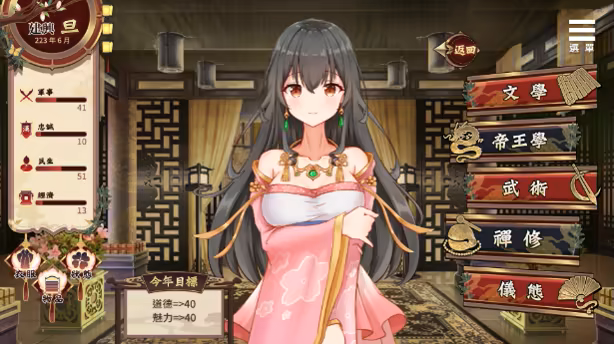在游戏中每个月可以决定两项国家政策,三项培养刘婵的安排。政策决定会影响国家的数值,对于刘婵的培养除了安排【学习】之外、也可以选择【谈话】、【出游】、【休息】来让刘婵得到平衡的生活,并培养好感。每一个选择与安排,都将影响着刘婵与这个国家的命运。