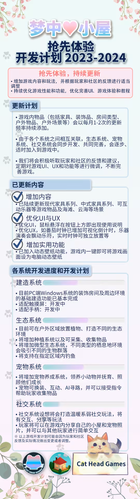 感谢大家对《梦中小屋》的支持,我们深知肩上沉甸甸的期待,我们唯一能做的就是更加努力把游戏做好,不负大家的期许、鼓励和支持。在抢先体验期间,我们将会按照开发计划,定期更新游戏内容和功能,同时也会积极听取玩家和社区的反馈,相对保持一定的灵活性,因此开发计划也不会一成不变。