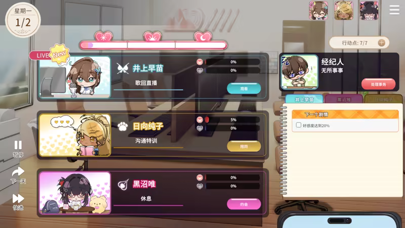 同步培养三位VTuber的你,需要好好分配行动点数,选择见证哪位女主角的成长。