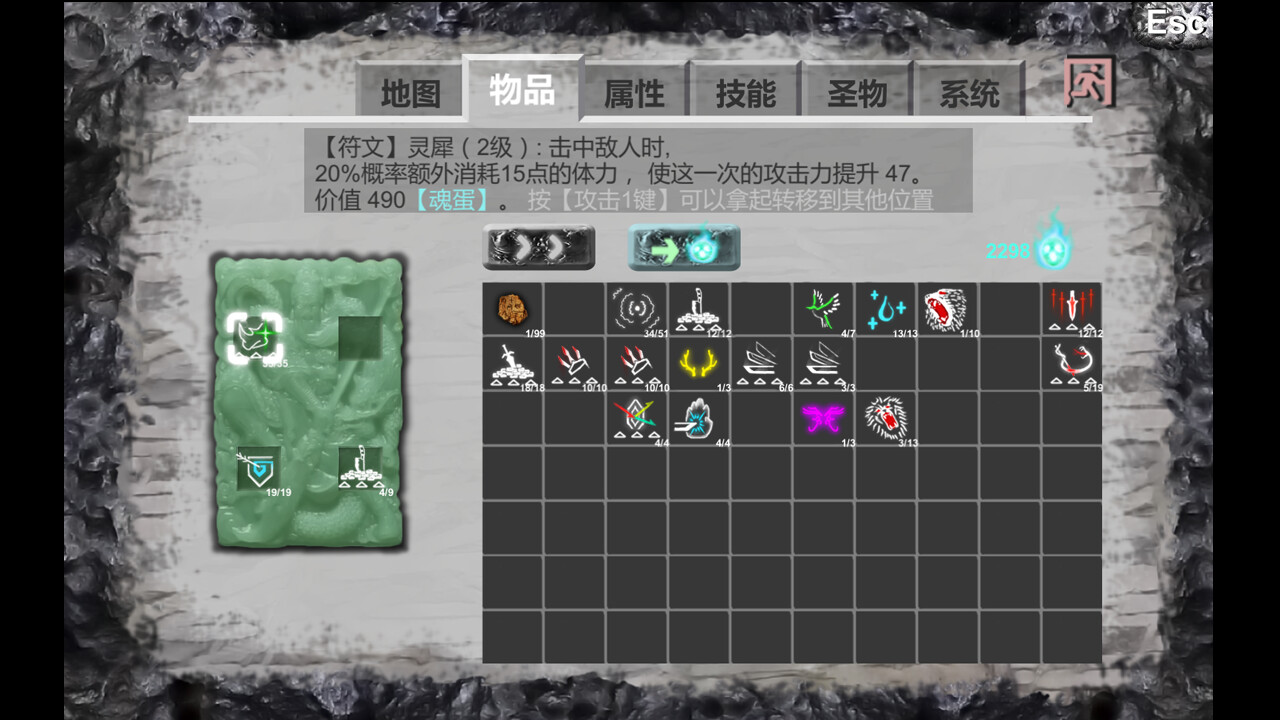 专门为本游戏动作系统设计的物品系统(之二),击杀第九个剧情boss后解锁。共15种属性增益宝石,可自由搭配。有宝石转换炉,可低级合成高级、可转化属性、可分解。