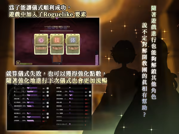 透过累积的行动点(AP)来强化你的能力,反覆进行仪式直至实现教团的目标。