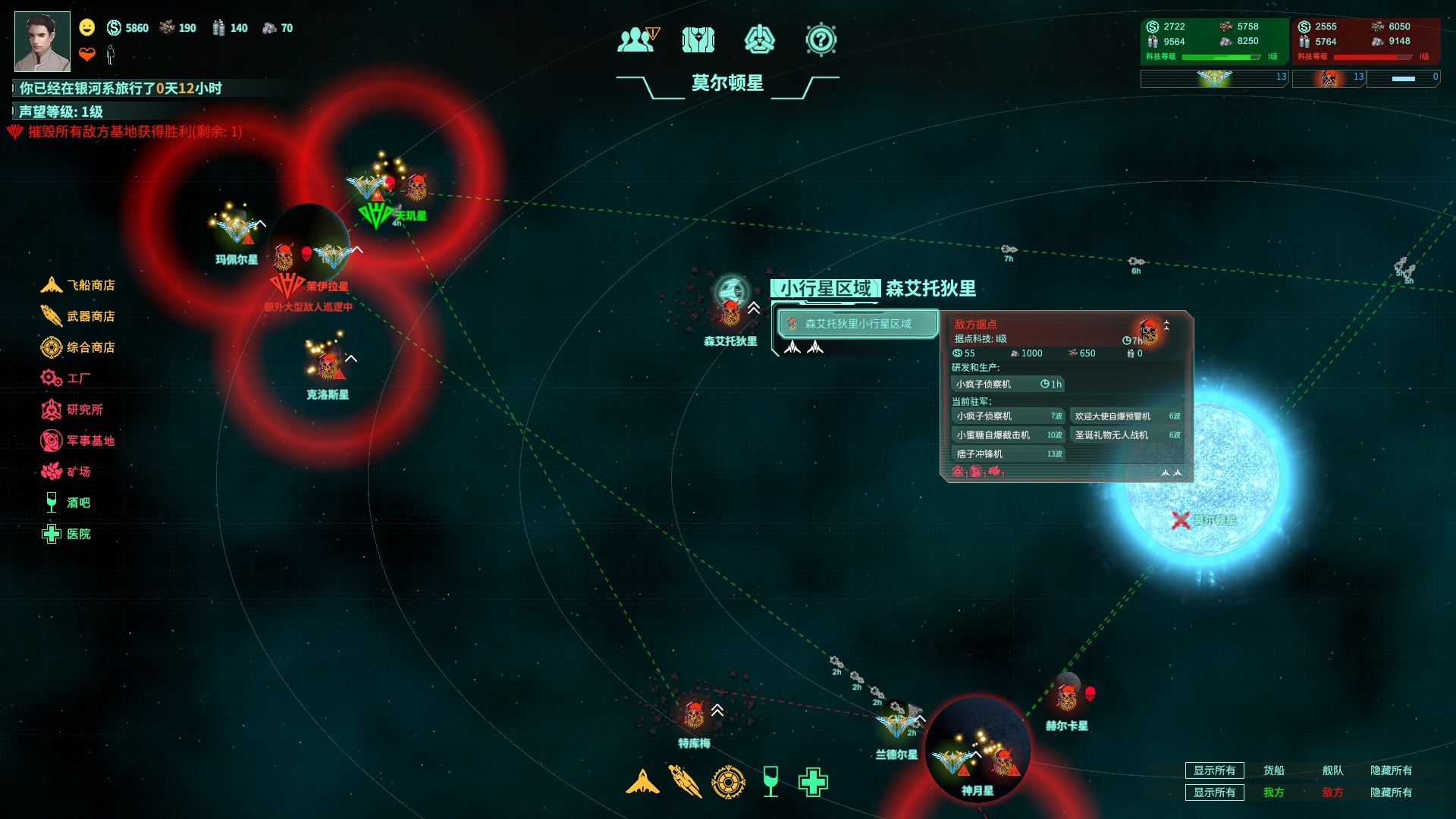 为了协助友方阵营占领资源丰富的据点,攻破敌方阵营基地,你驾驶着一艘实验级飞船穿梭于各个行星,卫星之间。在这个过程中,各个阵营的资源和科技都在不断发展,你需要不断强化友方阵营势力,削弱敌方阵营势力,才能取得战争的胜利。当然,你也不能忘记强化自己的实力,研发更高级的飞船,更强大的武器装置,招募优秀的船员,才能让你在面对各种敌人舰队时能从容应对,突破重围。在飞行过程中,你也会遇到各种各样的突发事件需要处理,请小心处理,它们对战局的影响不可忽视。