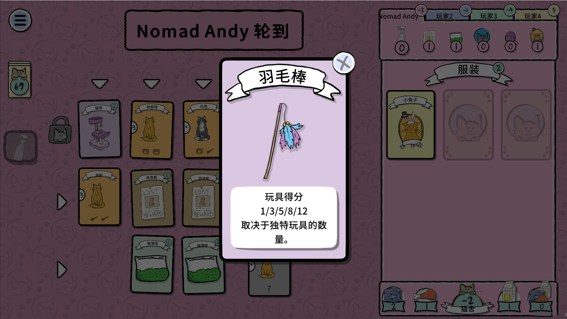 游戏中,你和你的猫女好友一回合可以抽3张牌,把玩具、食物、猫薄荷、服装,当然还有可爱的猫咪们通通收集起来。不过你要小心!一定要确保有足够的食物来喂猫,不然会被扣分。