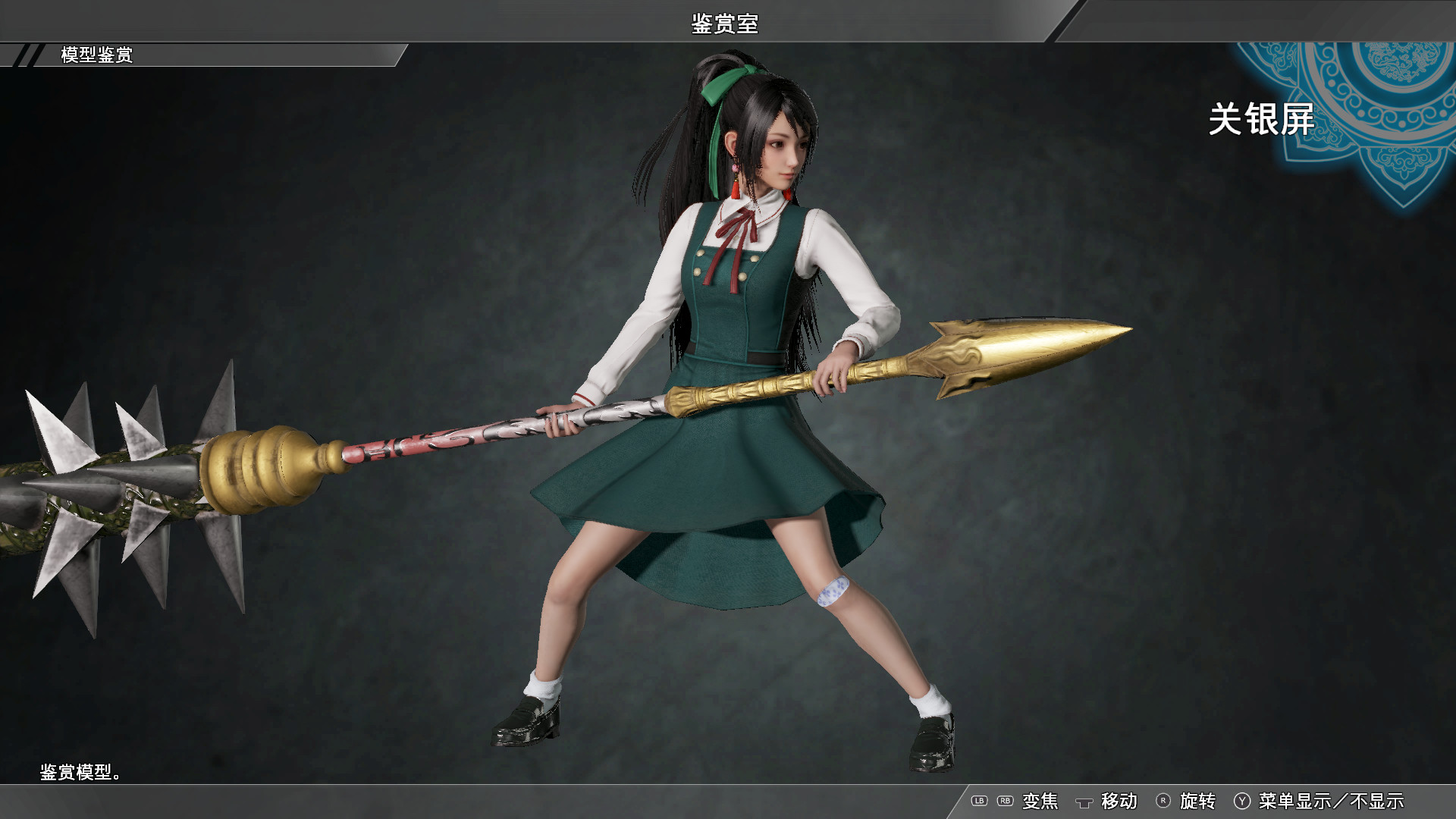 在标题菜单选择【鉴赏室】,从【无双武将一览】中选择关银屏。请在【变更服装】的【普通服装】中设定服装。