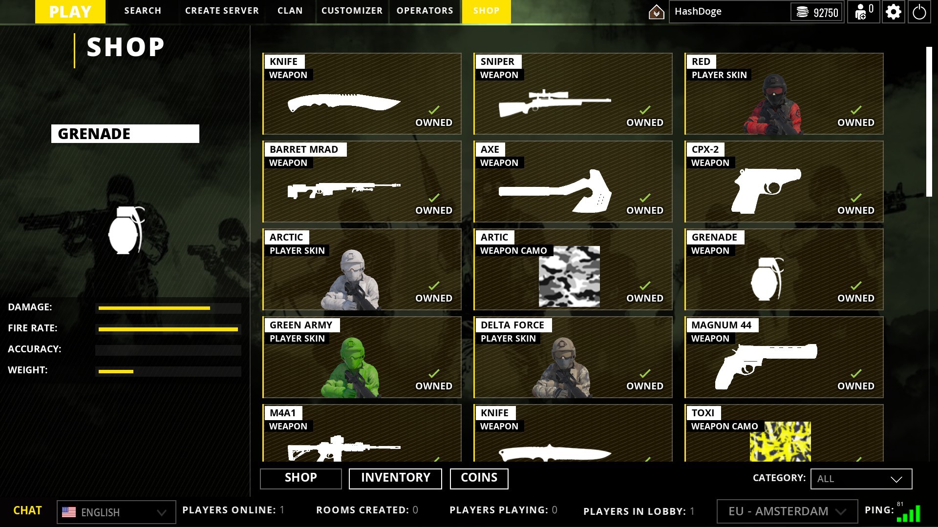 As the main player, you are equipped with a machine gun, shotgun, or sniper rifle depending on your class with a gun and a knife and a hand grenade.