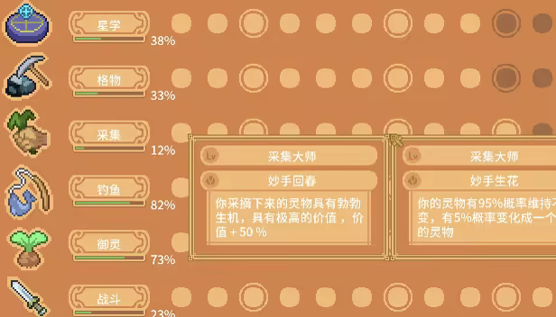 玩家人物拥有六项技能:星学、钓鱼、格物、御灵、战斗、采集,每一项达到一定等级都能解锁特殊的天赋,总共达到一定程度后甚至能够解锁失落的神器…