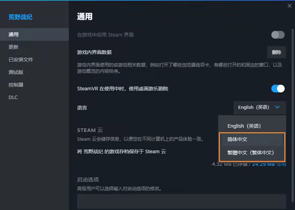 另外如果遇到启动游戏时变为英文的情况,可以通过鼠标右键Steam库中的《荒野战纪》图标,点击“属性”-“通用”-“语言”中,选择“简体中文”或“繁体中文”,这样游戏启动后就会直接显示对应语言,不会再出现语言被重置回默认英文的bug了。