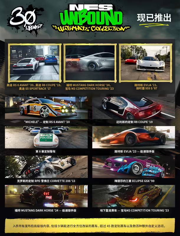 仅需终极合集这一个组合包,您就能释放《极品飞车:不羁》的终极体验。合集中包含《极品飞车:不羁》,您可立即获得所有发布后高级版内容与第 9 章高级版速度通行证。 获得 9 辆能进行全方位改装的车辆、超过 45 种定制项目以及 100+ 项额外装扮。