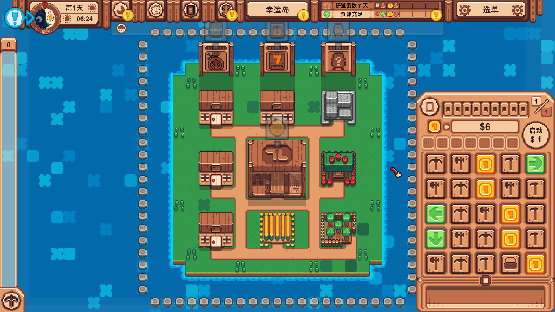 幸运岛是一款结合岛屿建造经营与拉霸机的轻度Rogue牌组游戏。随着游戏中各种事件的发生,玩家可以建构自己独特的牌组来进行拉霸让岛民自动搜集建造岛屿所需的资源。玩家可以用这些资源建造经营自己的梦想之岛。
