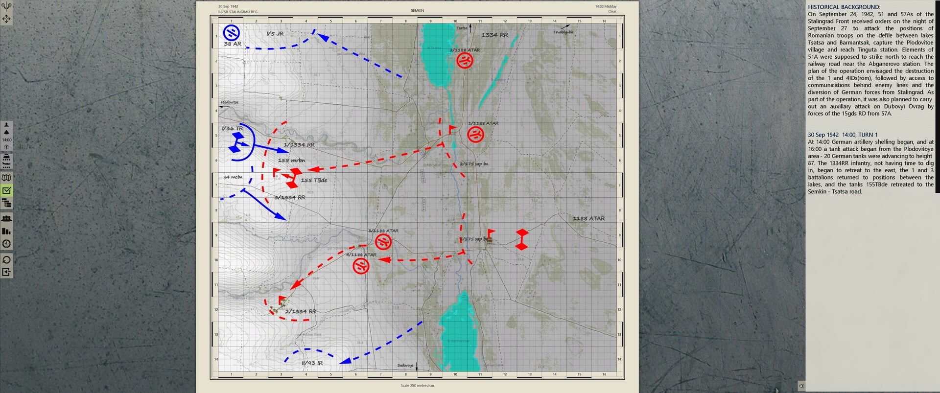 Soviet troops broke through the Romanian defenses in the defiele of Sarpinskie Lakes, and advancing to Abganerovo r/w station, with the task to cutting German supply lines of armies fought in Stalingrad area. The German HQ began transferring reserves to the sector of the breakthrough.