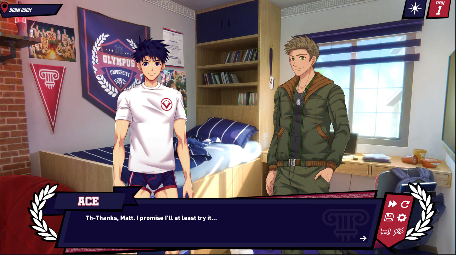 Jock Studio is a Boy’s Love / Yaoi Dating Simulator that features the adventures of Ace Anderson, a directionless freshman at the prestigious, all-boys sports college, Olympus Univeristy! Ace has always floated through life without meaning, but he’s about to find his purpose in the most unlikely of places – the infamous Jock Studio!