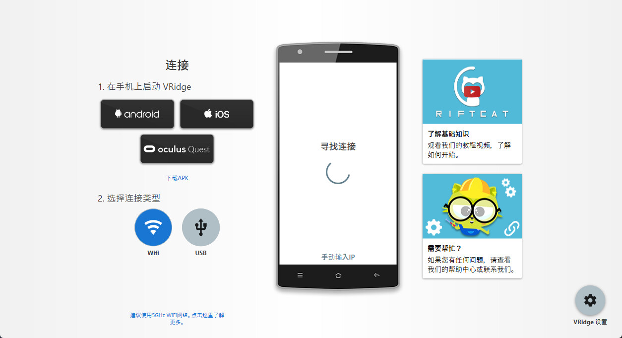 - 按照 RiftCat 应用程序中的内置说明,通过 WiFi 进行连接。