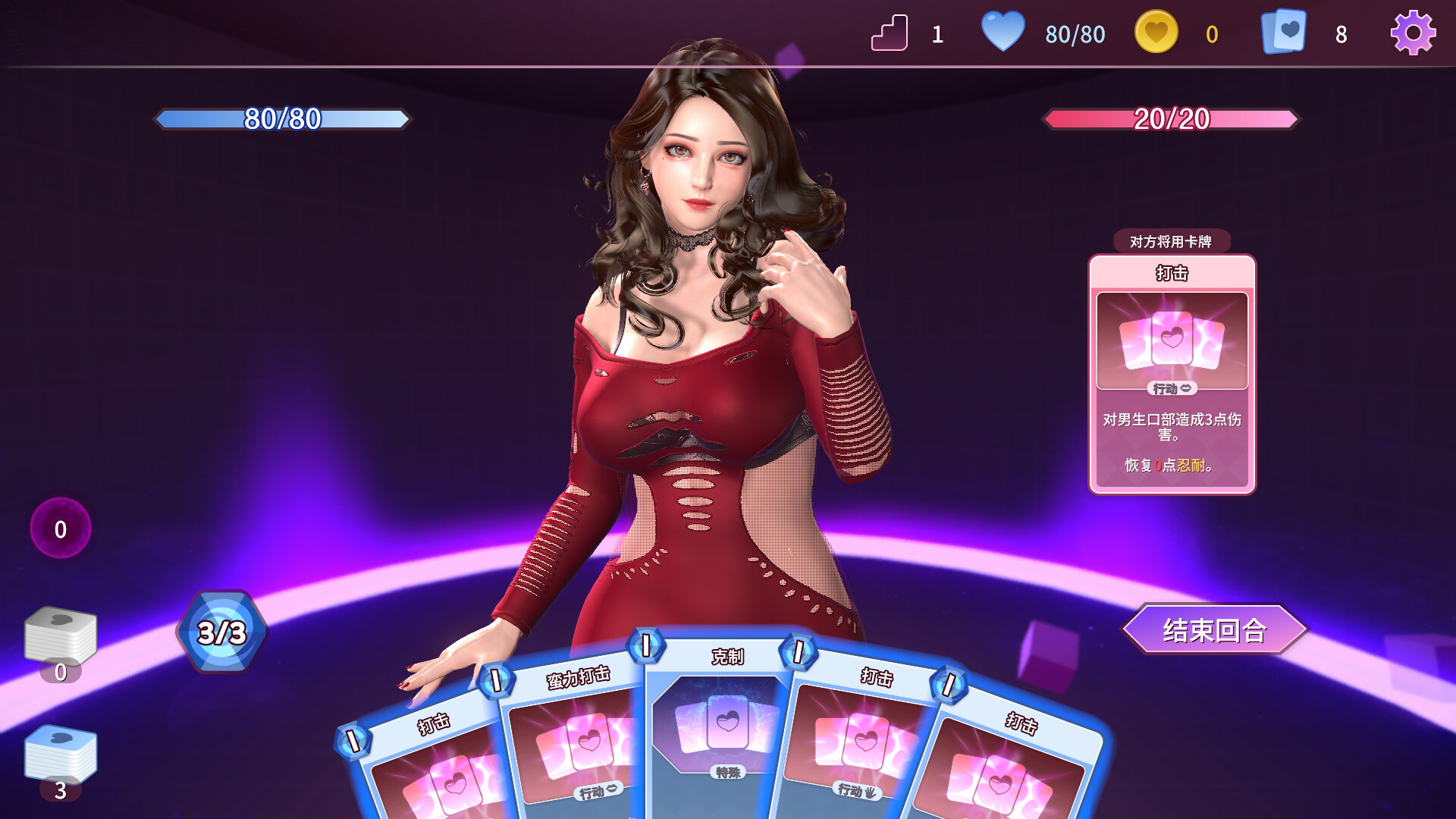 玩家在随机生成的地图中,构筑卡组,并使用卡牌与女孩进行对战,使用不同的卡牌选择女孩的不同部位造成伤害。