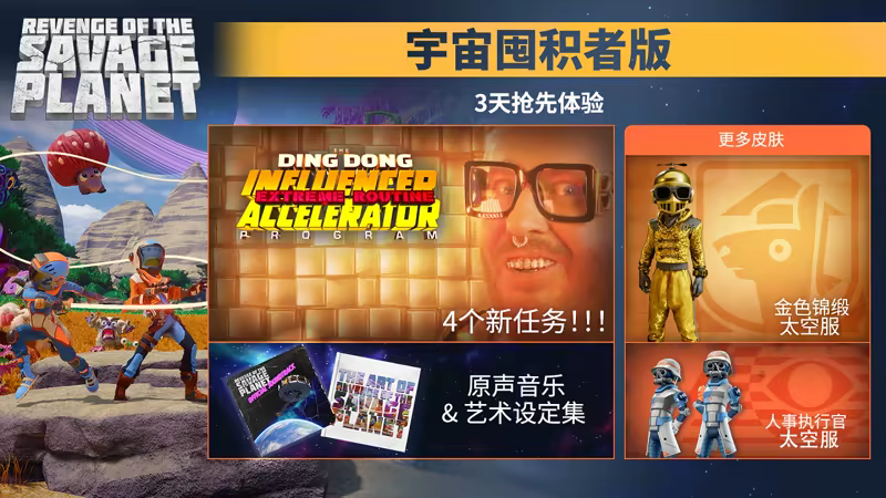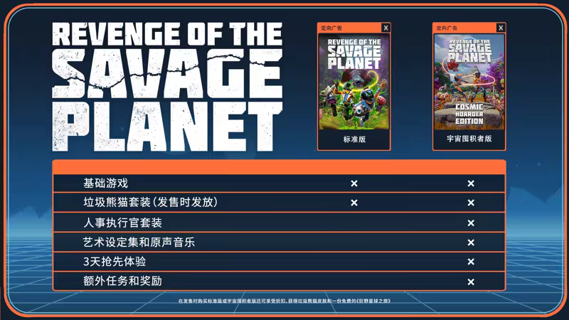 《狂野星球复仇记》(Revenge of the Savage Planet) 是一款欢乐的讽刺科幻冒险游戏。在游戏中,你可以跳跃、射击,收集各种物品,探索五彩斑斓的外星世界,解锁新装备和升级物品,同时揭开各种隐藏的秘密。