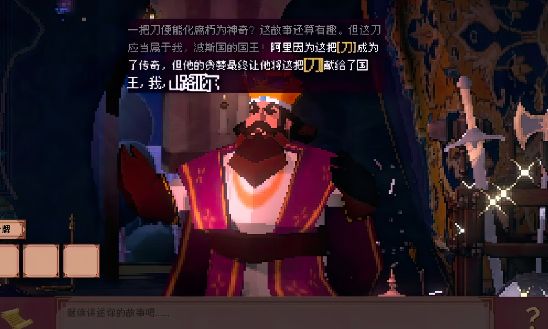 发挥你的想象力!讲述故事,勾起AI国王的兴趣,引他说出你所需的东西——像‘剑’、‘刀’ 或 ‘盾’等话语,将化为真实的武器!