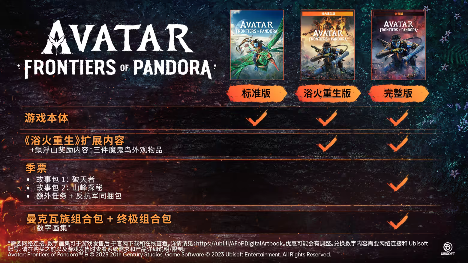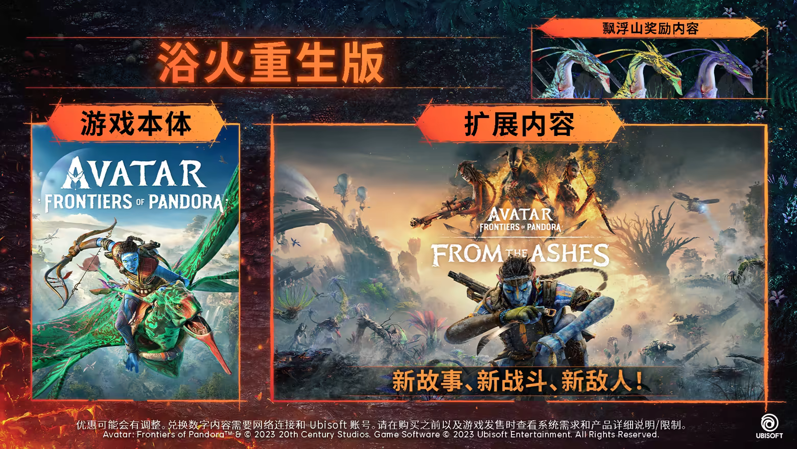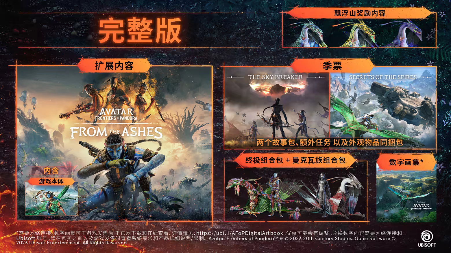 内含游戏本体、季票、外观物品、奖励内容、数字画集和灵感源自电影《Avatar: Fire and Ash》的扩展内容——《浴火重生》。