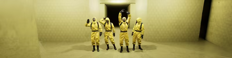 You are a group of 4 people armed with modernized HAZMAT suits. The leader of the group has the equipment to open the doors on level 15 Futuristic Halls . Bringing the equipment and rescuing the lost research group is your main task.