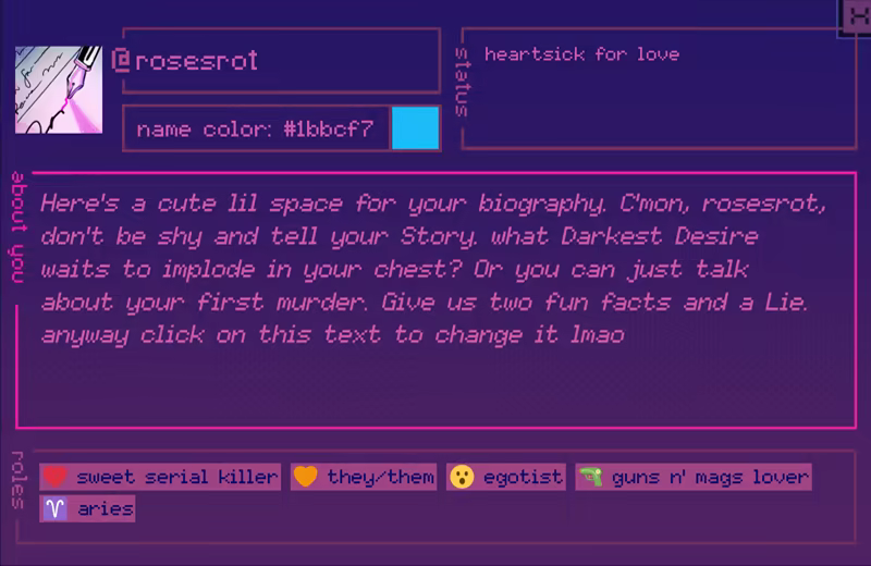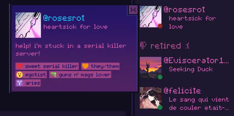 This is the demo for Killer Chat! Expanded Edition. This contains Month 1 of the game! We’re hoping to update this demo with content exclusive to the Expanded Edition once rosesrot has the funds to do so.